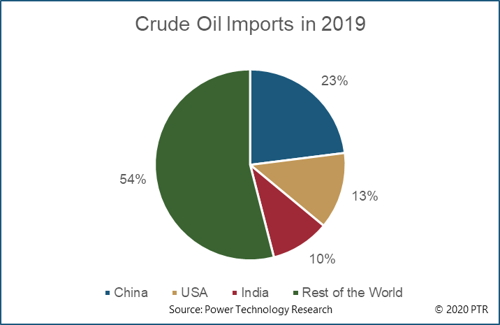 In 2019, imported global crude oil purchases stood at 1.05 trillion USD. This number has risen almost 25 percent since 2015 when total crude oil imports were 841.6 billion USD. China, India and USA constitute 46 percent of total global crude oil imports. Details of total crude oil imports in 2019 can be seen in the figure 1 below.