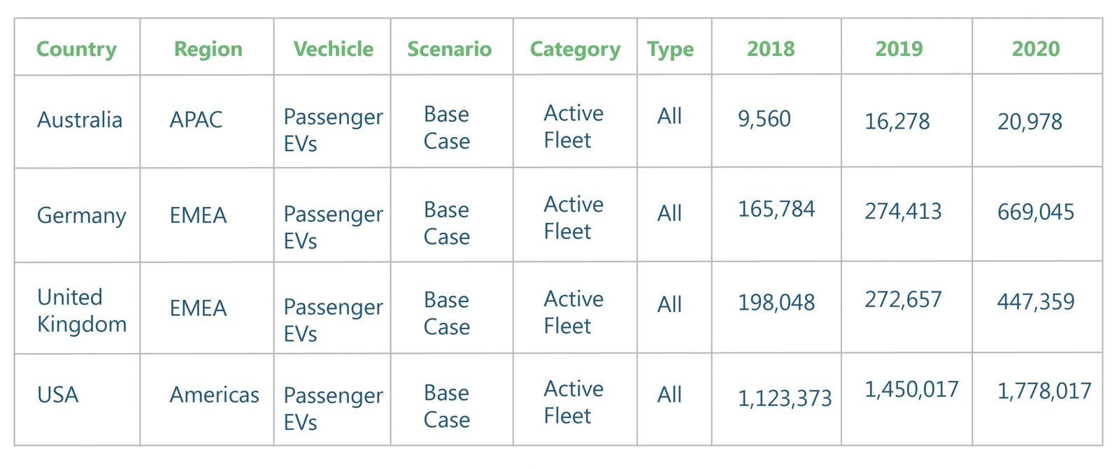 Figure 1: Passenger Electric Vehicles in Australia, Germany, UK and U.S. from 2018-2020.