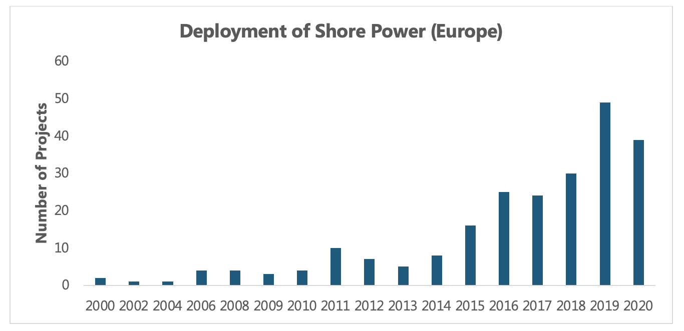 Shore power is not a new concept. In the year 2000, the Port of Gothenburg in Sweden was the first to offer shore power to vessels. Since then, significant work has been undertaken to make the technology more accessible, scalable, and customizable. The graph below indicates the rapid growth in the deployment of shore power technology in ports across Europe in past years. The dip in the year 2020 is due to COVID which has impacted all maritime sectors.