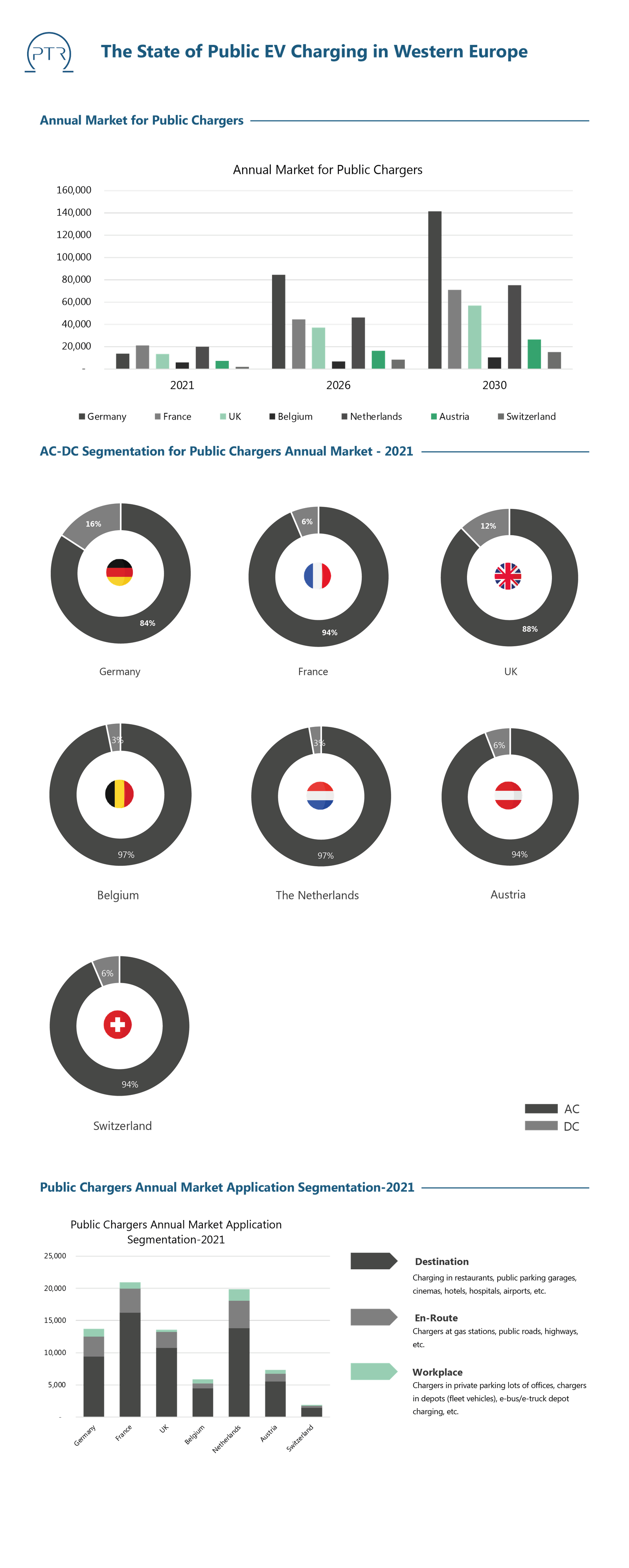While the uptake of passenger EVs has seen decent growth in Western Europe, with a CAGR of 26%, public charging infrastructure development remains slow. The following infographic gives an overview of the major EV charging markets in Western Europe i.e., Germany, France, Belgium, the Netherlands, Austria, Switzerland and the UK as well as their growth in the future.