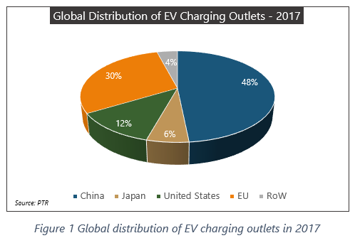 A number of utilities have announced large scale installation of publicaly accessible charging stations and State Grid Corporation of China (SGCC) is one of them. In fact, China has emerged as a market leader in installed charging infrastructure as it increased its publicly accessible charging stations by almost 51% in 2017. This has brought China’s public charging outlets market share close to 48% globally. The graph below shows the global distribution of public EV charging outlets in 2017.
