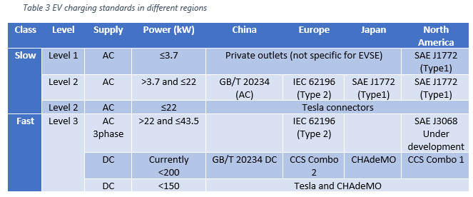 With an increase of input kW capacity, the weight of the onboard charger also increases due to bigger hardware components for AC to DC conversion and power quality conditioning. DC fast chargers (also known as Level 3 chargers) can solve this issue because AC to DC conversion is done outside the vehicle with the charging station looking like a gas pump-sized machine. Theoretically, all commercially available chargers are either based on slow AC charging mechanism (level 1 & 2) or DC fast charging. However, there are different standards used by car manufactures for the charging plug and communication protocol required to keep track of battery parameters. For example, Tesla has the Supercharger Network; Nissan Leaf and other models utilize CHAdeMO, and other groups use SAE Combo standard called combined charging system (CCS). The chart below summarizes the EV charger capacity and their relevant standard types adopted in different regions.