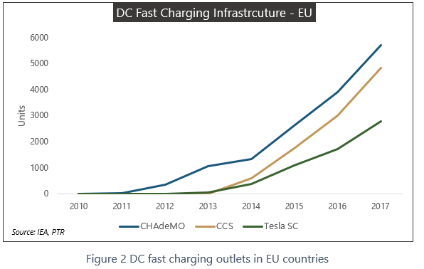 There is a possibility that all charging standards keep on penetrating the market with multi-standard charging stations, but some recent events indicate that there might be a conclusive win. In 2016, Tesla motors joined ‘CharIn’, an association which fully backs CCS. In 2017, Honda, a mainstream Japanese car manufacturer, opted for CCS on its ‘Honda Clarity (BEV)’ which could be an indication of a turning point in this competition for standards. Additionally, South Korea officially announced to adopt CCS as the fast charging standard earlier this year. And finally, European car manufacturers BMW, VW, and Daimler created a joint-venture to install 400 charging stations by 2020 in EU countries. Even though CCS has a wide range of ‘silent supporters’, it still has not had the same level of committed support like Nissan and Tesla’s have shown for CHAdeMO and Supercharger, respectively. It will also be very interesting to see the European Union’s role in harmonization of charging standards in the coming years. The graphs below depict CCS is approaching CHAdeMO levels with the backing of top-tier automotive OEMs in EU.