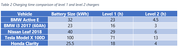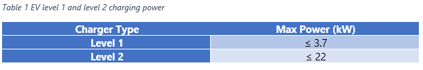 Some of the home chargers and most of the public chargers are level 2 chargers. Grid connections at voltages 230V (United States) or 400V (Europe) are required for level 2 chargers. Level 2 chargers also include a built-in AC-DC converter. The major differences are the amount of power available and, consequently, the time needed to reach full state-of-charge. Level 2 chargers have significantly higher power levels than level 1 chargers, as shown in Table 1.